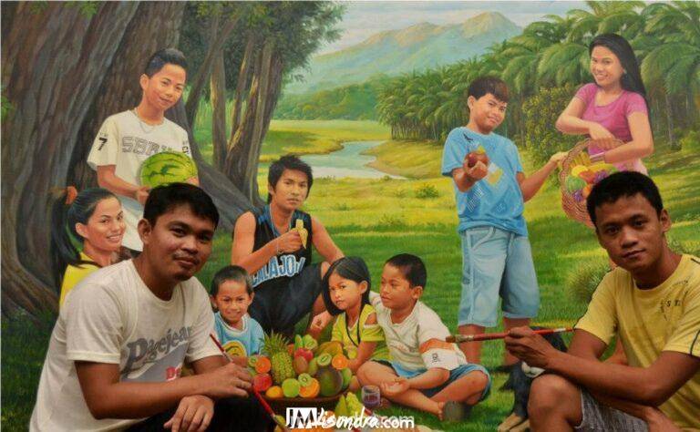 The mural, rendered using the timeless medium of oil on canvas, portrays a vibrant scene of eight cousins joyfully engaged in a picnic amidst a backdrop adorned with majestic coconut trees. Lisondra and Galpo skillfully crafted this lively tableau, evoking a sense of nostalgia and shared happiness within the family.