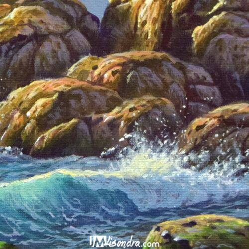 Overall, "Rocky Beach and Crashing Waves" is a stunning piece of art that captures the beauty of nature in a unique and captivating way. It's a must-have for anyone who loves the ocean, nature, or is looking to add a touch of tranquility to their space.