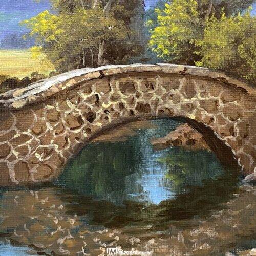 The use of rich acrylic hues adds depth and dimension to the scene, creating a mesmerizing interplay of light and shadow that breathes life into the canvas. Whether bathed in the golden glow of dawn or cloaked in the soft hues of twilight, "The Bridge" exudes a timeless allure that captivates and enchants.